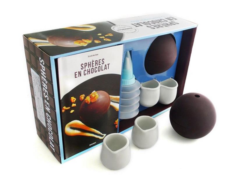 Este kit contiene un libro con fotografías y explicaciones paso a paso para elaborar esferas de chocolate negro, con leche o blanco. Incluye información sobre cómo entibiar el chocolate, sobre el molde y cómo desmoldar una esfera y sobre su decoración.El libro incluye recetas distintas de esferas rellenas y sus respectivos coulis calientes para acompañar: esfera de chocolate negro con mousse de caramelo y nueces caramelizadas; esfera de frambuesa y chocolate blanco; esfera de tres chocolates y avellanas tostadas...; entre otras.