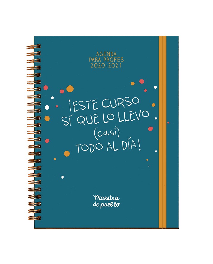 Cuenta con cierre con goma elástica, papel de alta calidad, encuadernación anillada, dos bolsillos para guardar notas, troquelado lateral mes por mes y cuatro páginas de adhesivos ilustrados. Además de por su diseño a todo color y acabados muy cuidados, esta agenda será la más codiciada en los claustros por sus guiños a los docentes con frases de Maestra de pueblo, divertidas ilustraciones y recordatorios en los días especiales.