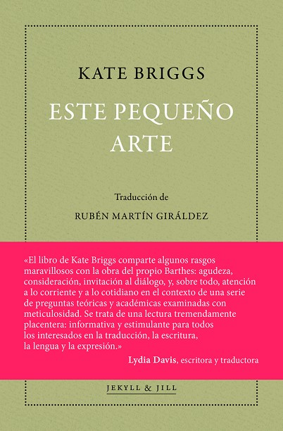 Tomando su propia experiencia de traducir las notas de las conferencias de Roland Barthes como punto de partida, Kate Briggs entrelaza varias historias para ofrecernos este retrato de la traducción literaria como una actividad intensamente relacional. Entre otras, narra la historia de las traducciones de Thomas Mann de Helen Lowe-Porter y su difamación póstuma, escribe sobre la relación amorosa entre André Gide y su traductora Dorothy Bussy o recuerda cómo Robinson Crusoe construyó laboriosamente una mesa, para él por primera vez, en una isla no tan desierta. Con Este pequeño arte, un relato bellamente estratificado de una experiencia de traducción subjetiva, Briggs emerge como una escritora verdaderamente notable: distintiva, sabia, franca, divertida y absolutamente original.