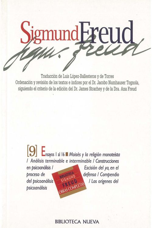 Esta edición de las Obras Completas de Sigmund Freud, en nueve tomos, pone a disposición de los lectores y estudiosos hispanohablantes la traducción de una obra fundacional. Entre los rasgos destacados de esta edición ya clásica se cuenta la traducción directa del alemán de Luis López-Ballesteros, que mereció el elogio del propio Freud. A este exhaustivo trabajo se suman la revisión de los textos de Jacobo Numhauser y su ordenamiento cronológico según el criterio de la edición de James Strachey y Ana Freud, el aparato crítico, que contribuye a esclarecer conceptos y referencias, y una selección iconográfica del autor, además de ilustraciones afines a su obra.